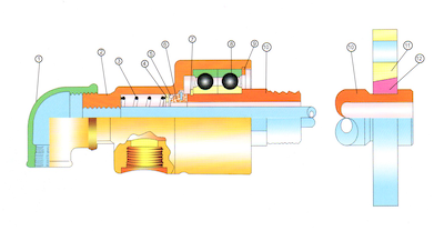 1.彎頭 2.殼體 3.彈簧 4.彈簧墊片 5.輔助密封圈 6.密封環(huán) 7.軸用擋圈 8.軸承 9.孔用擋圈 10.外管 11.快環(huán)法蘭 12.半分環(huán) |